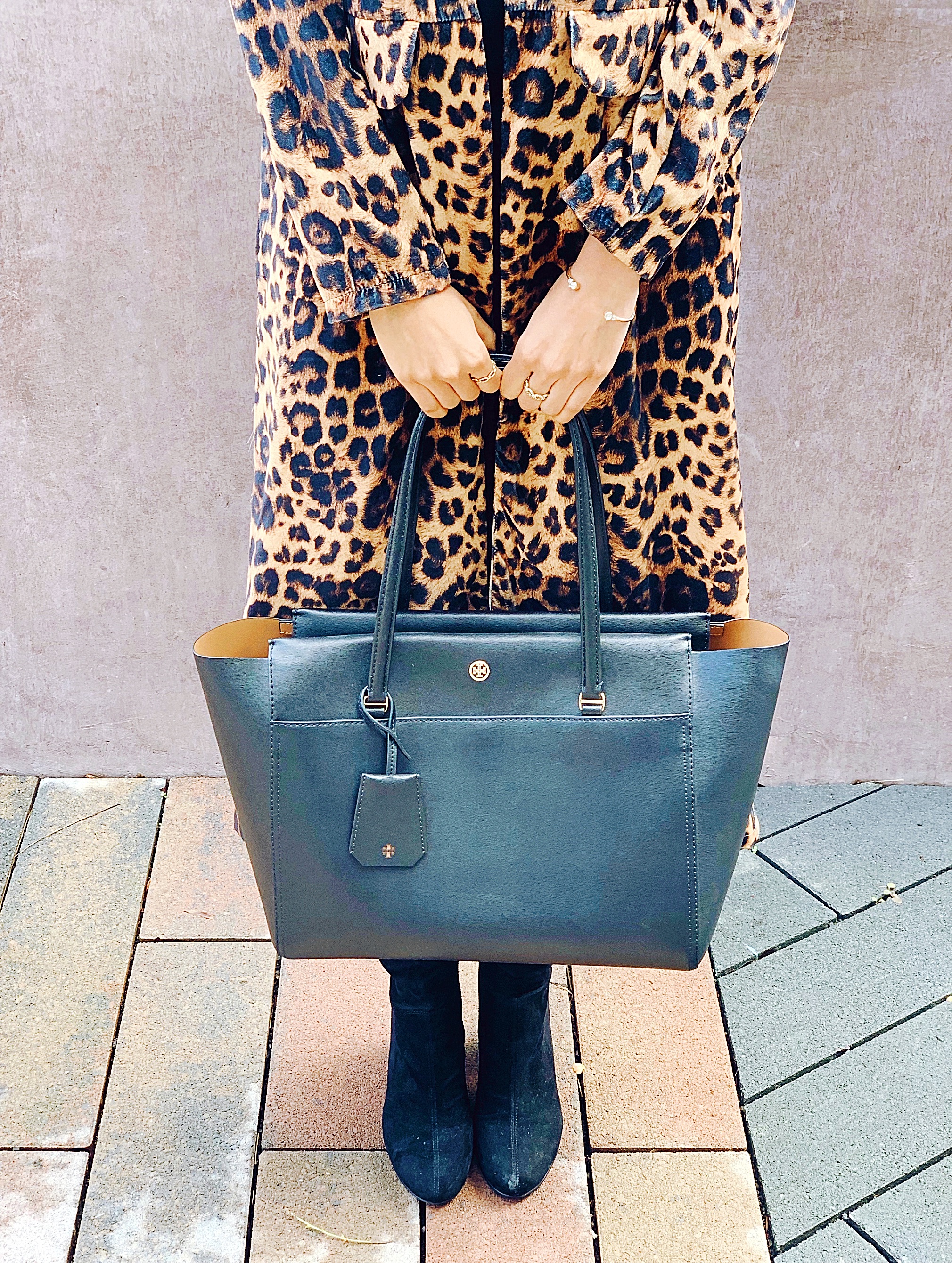 I styled this leopard duster with an all-black ensemble – turtleneck, jeans and heeled boots. This duster is a statement piece, and I wanted it to do all the talking. By pairing this duster with a turtleneck, it looks less like a bathrobe and really gives you that boss lady vibe. It would look great over a dress as well, and it’s true to size.